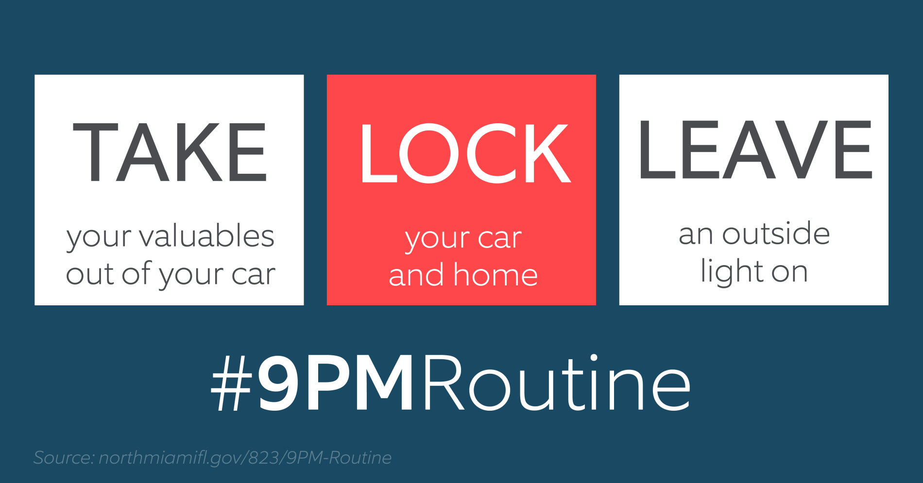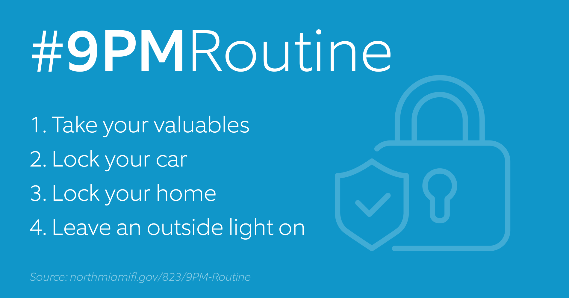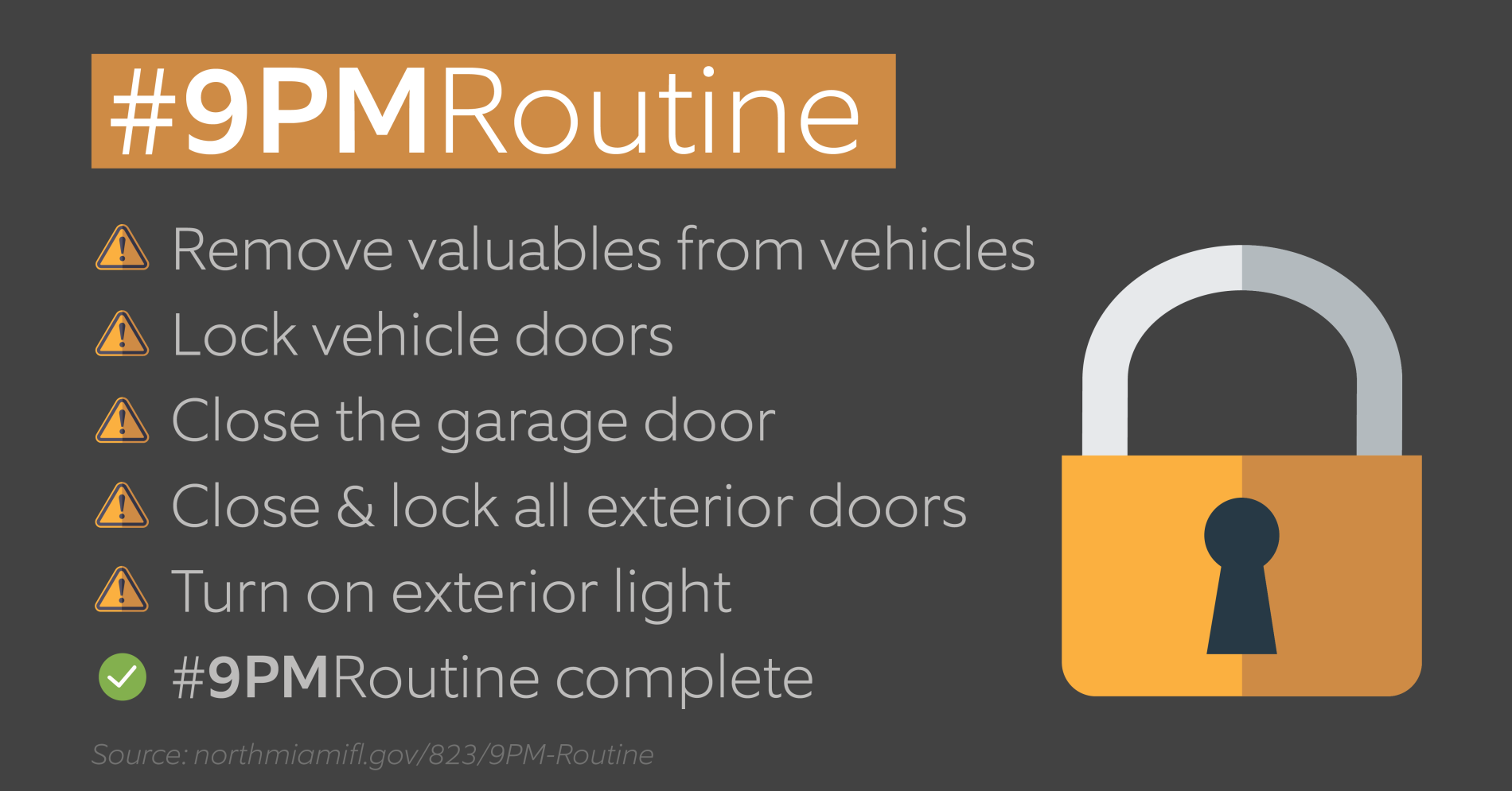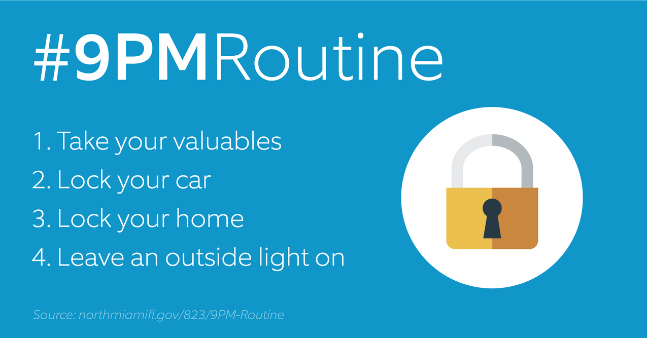 The idea of "9PM Routine" is to encourage people to take a few simple steps every night at 9 p.m. to help prevent theft and keep their homes and vehicles safe. Burglars are criminals of opportunity. The easier it is to burglarize your home without getting caught, the more likely they are to commit the crime. If you make burglarizing your house a bit more difficult, you reduce the likelihood of your house getting hit.