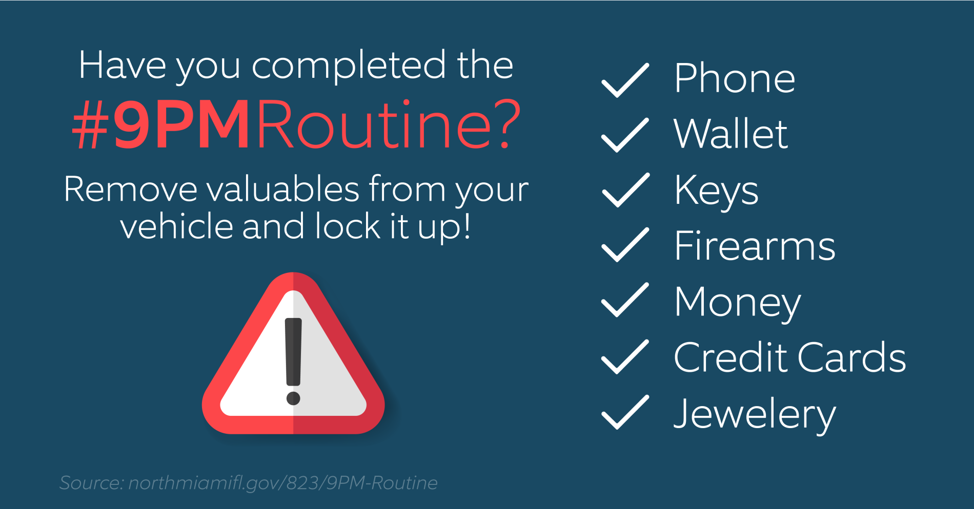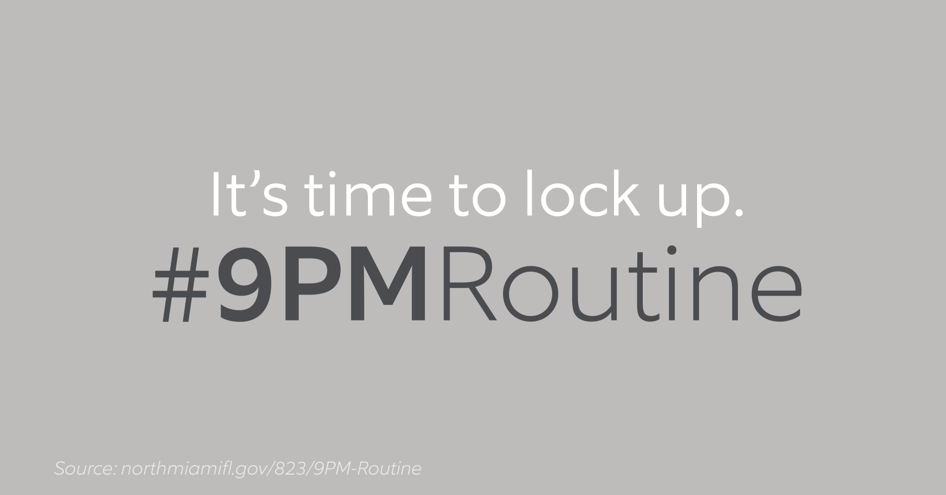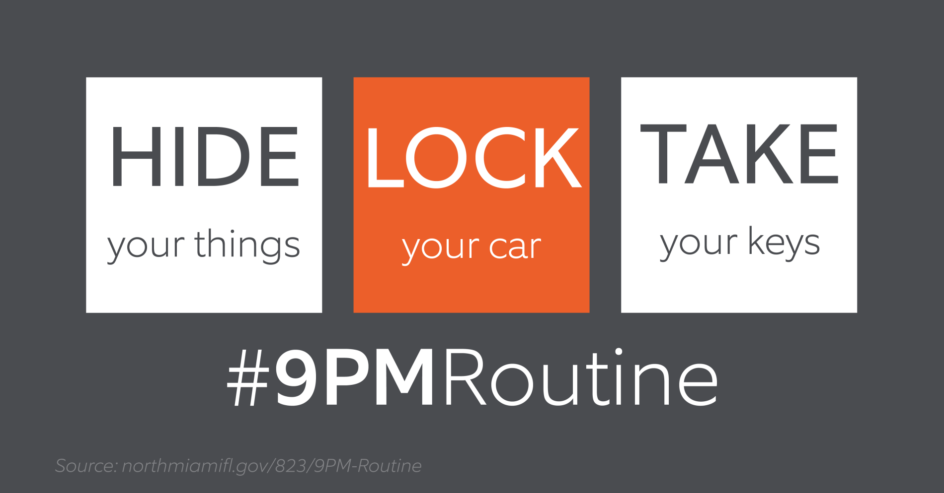 The idea of "9PM Routine" is to encourage people to take a few simple steps every night at 9 p.m. to help prevent theft and keep their homes and vehicles safe. Burglars are criminals of opportunity. The easier it is to burglarize your home without getting caught, the more likely they are to commit the crime. If you make burglarizing your house a bit more difficult, you reduce the likelihood of your house getting hit.