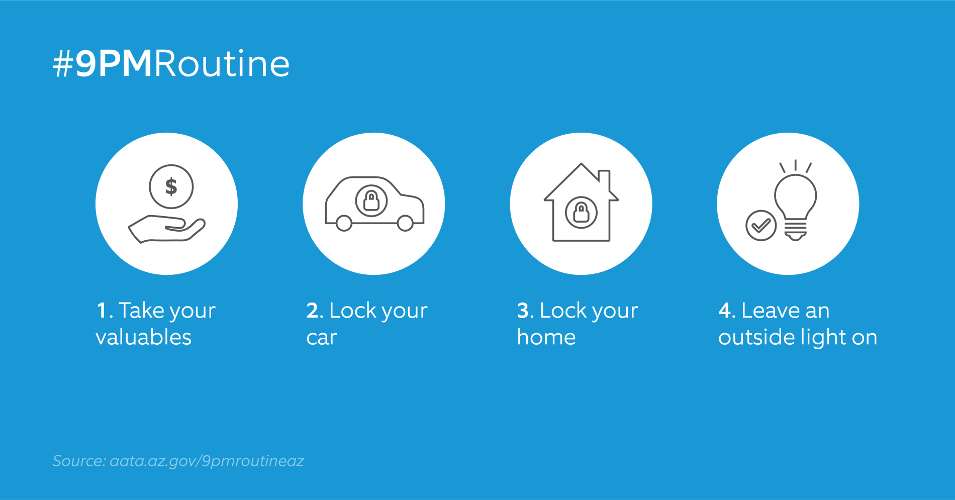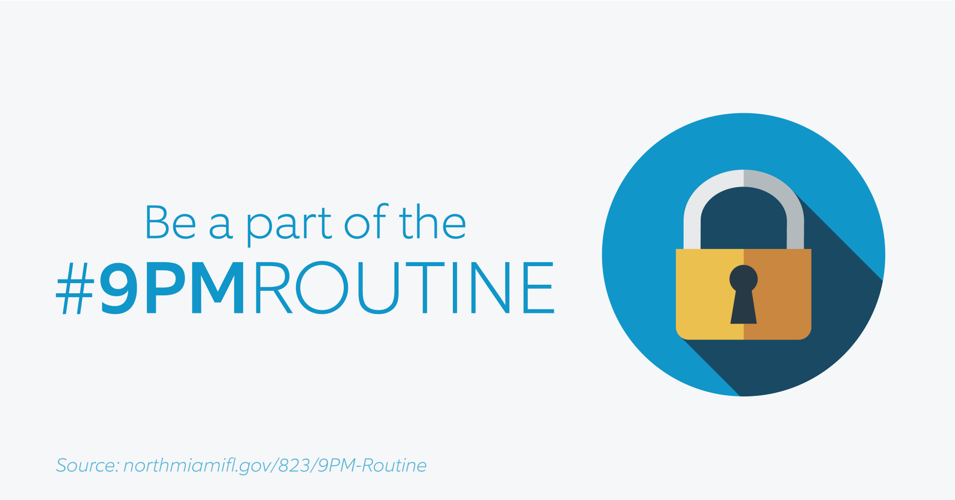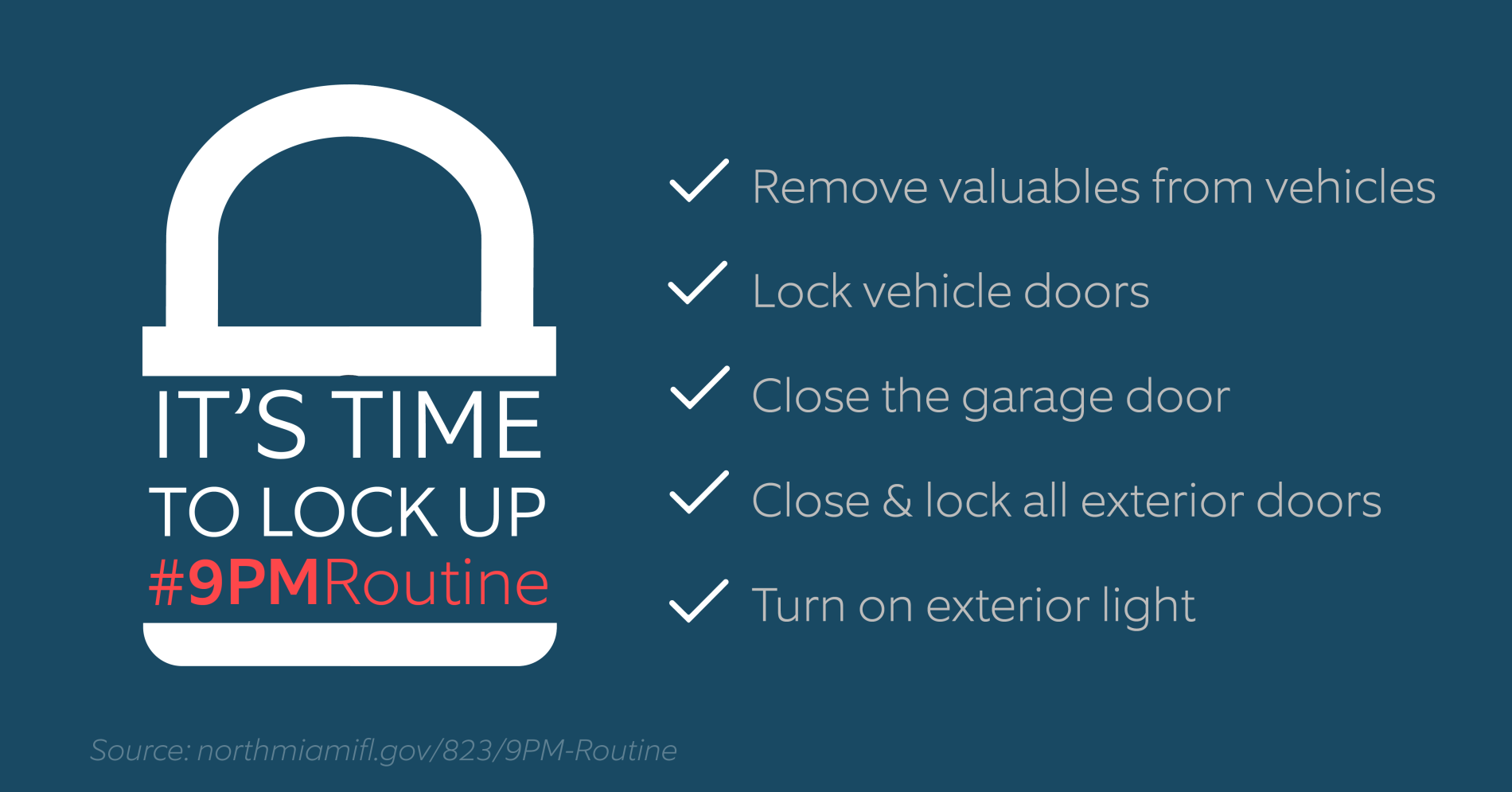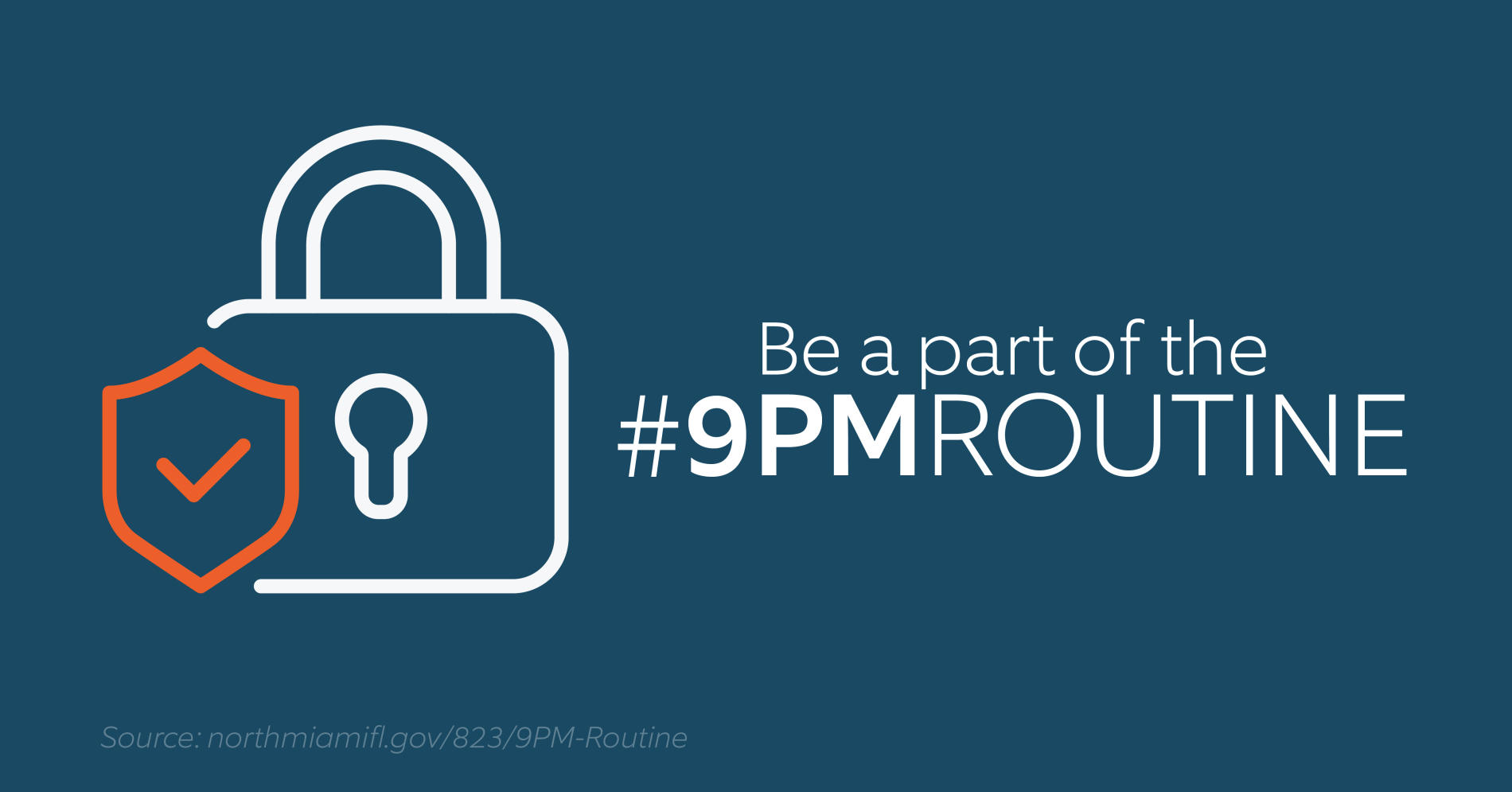 The idea of "9PM Routine" is to encourage people to take a few simple steps every night at 9 p.m. to help prevent theft and keep their homes and vehicles safe. Burglars are criminals of opportunity. The easier it is to burglarize your home without getting caught, the more likely they are to commit the crime. If you make burglarizing your house a bit more difficult, you reduce the likelihood of your house getting hit.